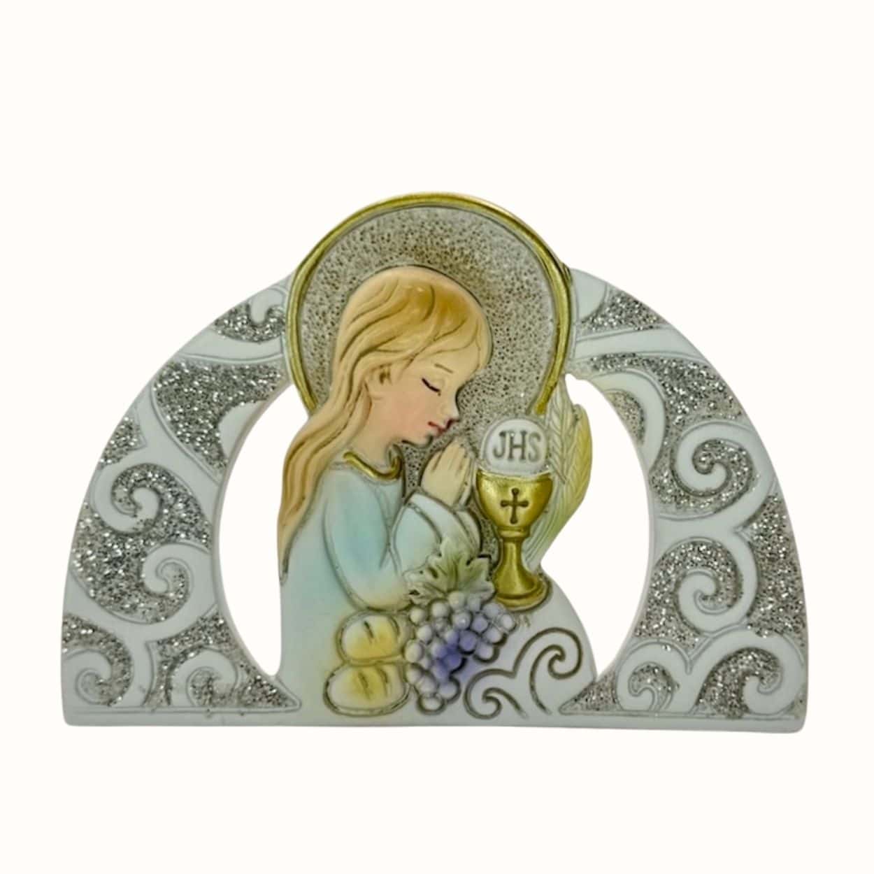 Zum Inhalt springenCreme / Silberfarbene Bomboniere als Aufsteller mit der Darstellung eines Kommunionmädchen mit Kelch und Weintrauben. Die Größe der Bomboniere beträgt ca. 10 cm. Diese anspruchsvolle Bomboniere wird Ihnen inkl. einer schönen Geschenkkartonage, einem gefüllten Mandelsäckchen mit Mandelkonfekt oder auch Schokokonfekt, einem beduckten Namenskärtchen nach Ihren Angaben bedruckt und für eine Erstkommunion geeignet, geliefert.
