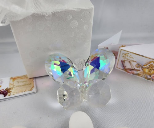 Zum Inhalt springenBomboniere / Gastgeschenk – Kristallaufsteller in Form eines Schmetterlings. Die Höhe dieser Bomboniere beträgt ca. 5cm. Dieser anspruchsvolle Kristallaufsteller für die Erstkommunion oder Taufe wird inklusive einer schönen Geschenkkartonage geliefert. Ein gefülltes Mandelsäckchen mit 5 Schokoladen- oder Mandelkonfekt der Fa. Maxtris ist ebenfalls dabei und natürlich das Namenskärtchen / Bigliettino das nach Ihren Angaben mit Name und Eventdatum bedruckt wird.