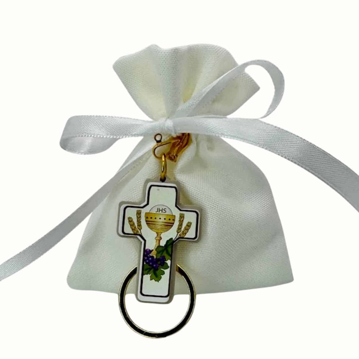 Zum Inhalt springenWunderschönes, cremefarbenes Mandelsäckchen / Sacchettino mit einem Schlüsselanhänger in Form eines Kreuzes welches die Abbildung eines Kelches zeigt. Perfekt geeignet für die Feier der Erstkommunion. Sie erhalten dieses entzückende Gastgeschenk gefüllt mit 5 Stück leckerem Mandelkonfekt oder auch Schokoladenkonfekt, wählen Sie bitte im Bestellvorgang selbst. Selbstverständlich ist auch ein Namenskärtchen für eine Erstkommunion, bedruckt nach Ihren Angaben, dabei.