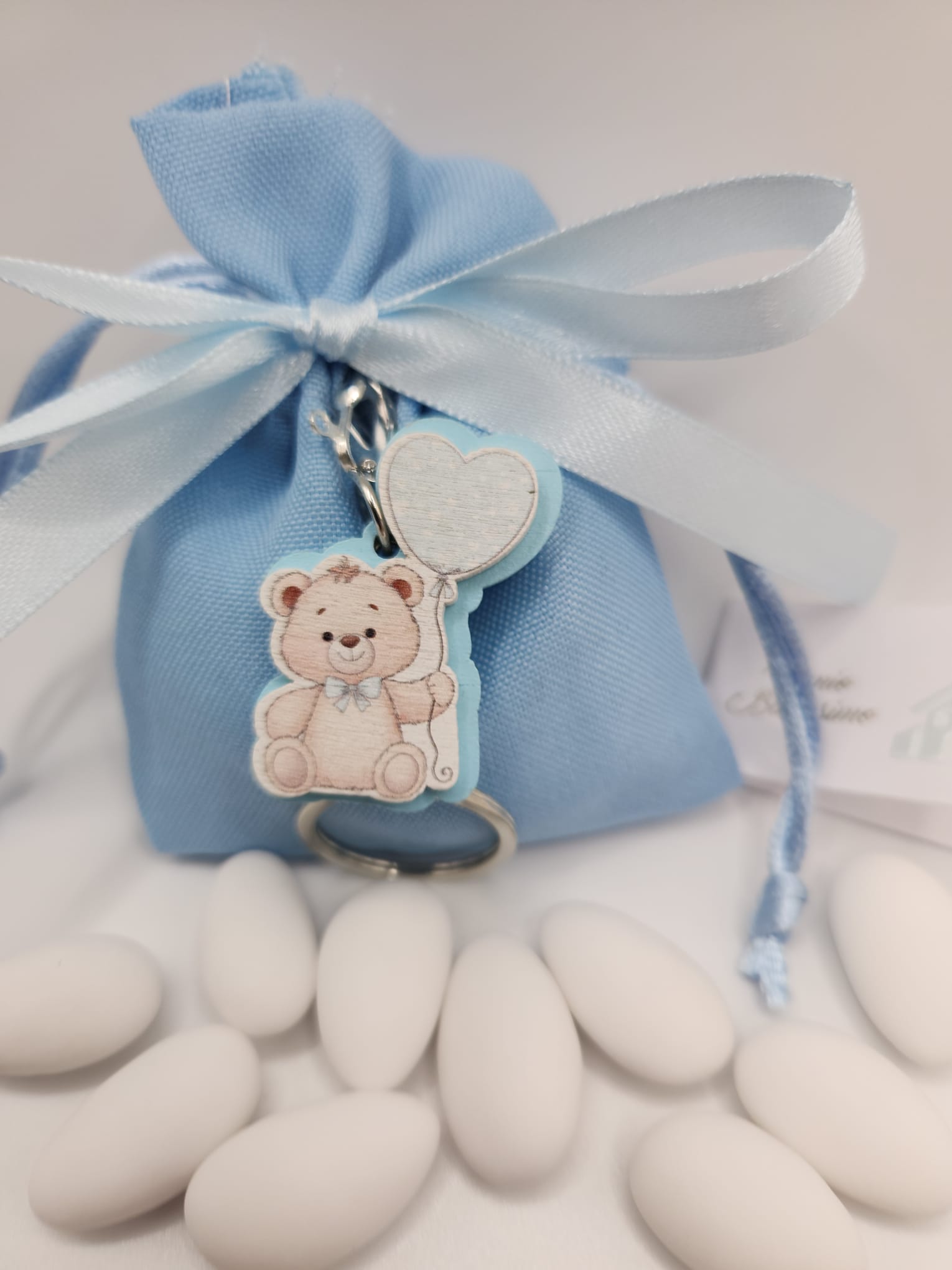 Mandelsäckchen in blau – eine süße Bomboniere aus einem blauenfarbigem Stoff mit einem hübschen Schlüßelanhänger. Ein Schlüßelanhänger auf dem ein niedlichen Teddybären ist. Im Inneren des Säckchens finden sich fünf feine Confetti-Mandeln oder Schokoladenkonfekt, begleitet von einem personalisierten Bigliettino mit Ihrem individuellen Text.
